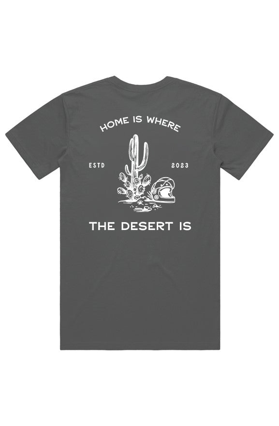 Featuring a clean graphic with desert detail and “HOME IS WHERE THE DESERT IS” typography, it’s built for off-road riders, campers, dune explorers, and anyone who knows the desert isn’t a place — it’s a lifestyle.