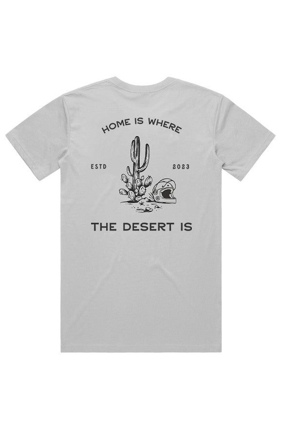 Featuring a clean graphic with desert detail and “HOME IS WHERE THE DESERT IS” typography, it’s built for off-road riders, campers, dune explorers, and anyone who knows the desert isn’t a place — it’s a lifestyle.